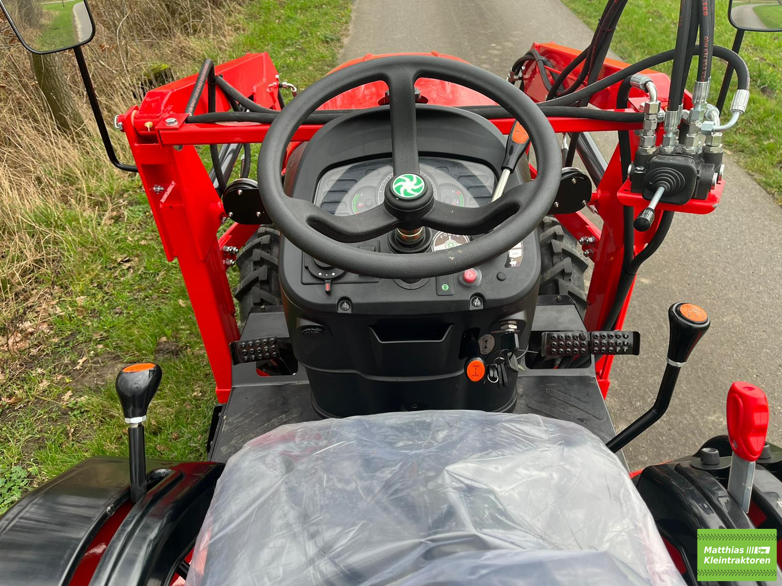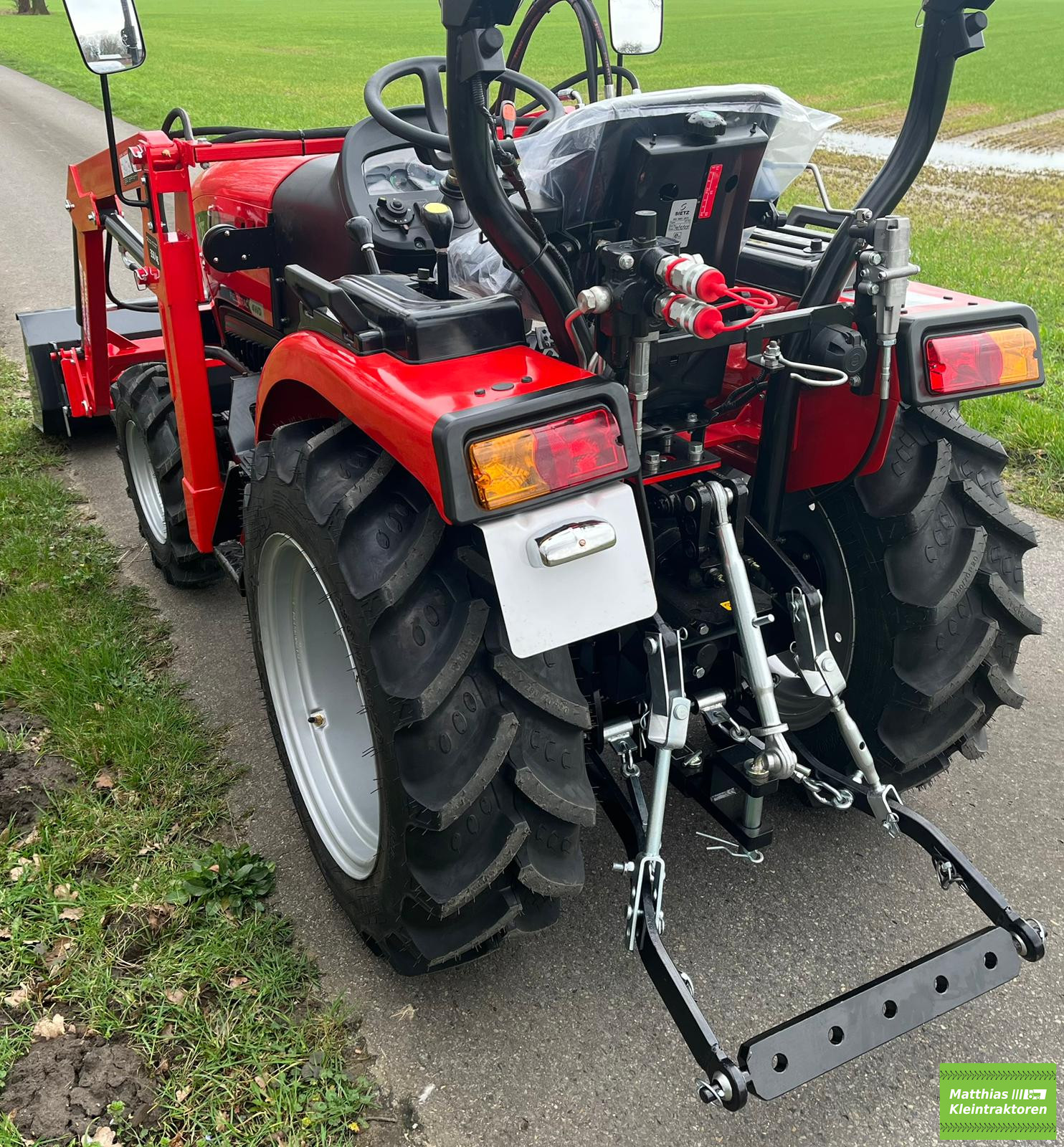 Frontlader mit Schaufel, Schnellwechselsystem und Einhebelsteuerung, Allrad zuschaltbar, Zapfwelle mit Zweigeschwindigkeiten 540/1000, Untersetzung, 4 Vorwärtsgänge und
